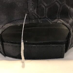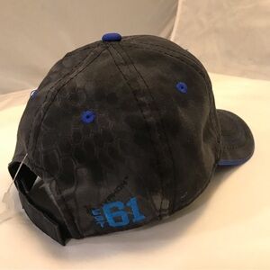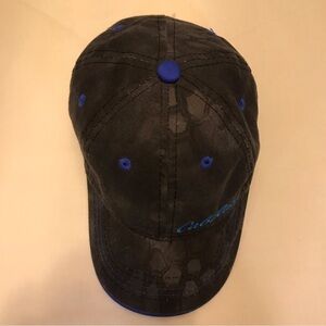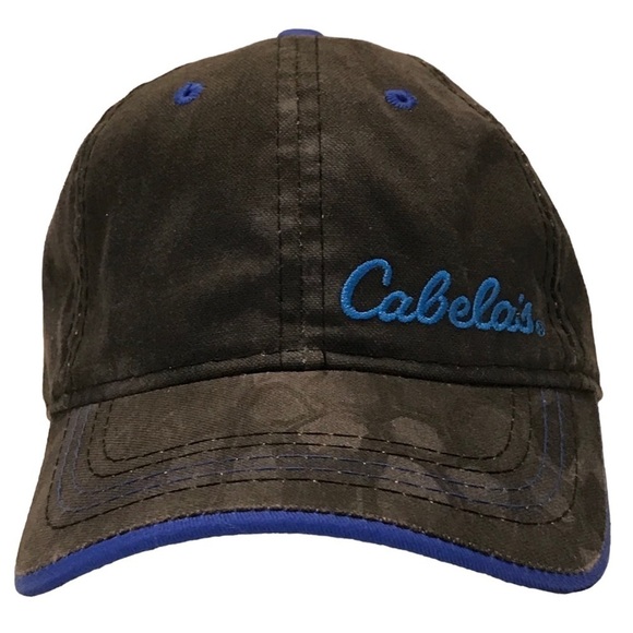 G4 Hat/Cap Cabela's Made in Vietnam Youth Adjustable Hook & Loop Strap Cabela's type on sideface plus EST'61 on rear quarter; all in aqua blue / Black hat with blue accents and bill border and blue underbill (faded image of animal footprint on bill?)