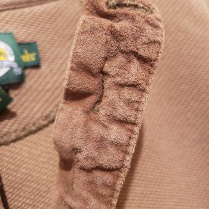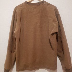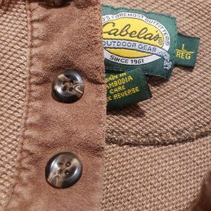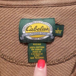 Cabelas mens long sleeve henley pullover. 100% cotton. Suede elbow patches. Heavyweight. RN 56835 P <--> P: 23.5" Shoulder: 8" Arm length: 26" Length: 26" Some noticeable wear on the suede. See photos.
