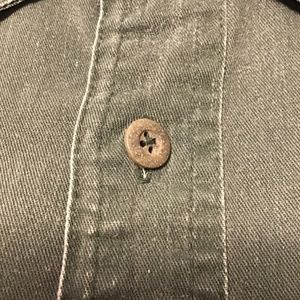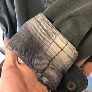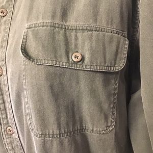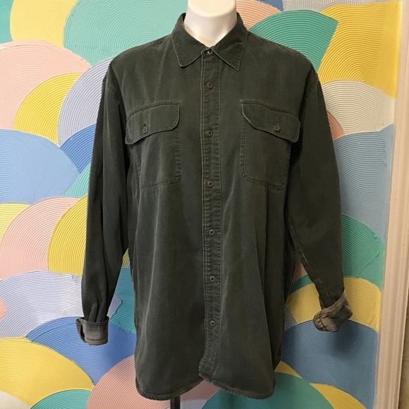 Cabela’s outdoor gear bottom Down long sleeve shirt size L regular color green the inside is flannel very warm and cool style. Has 2 front chest pockets with buttons.