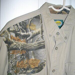 Cabela's tan and camo men's hunting long sleeved shirt, brushed cotton. Large.