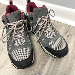 Excellent used Condition Women’s Cabela’s Ascend Lisco Grey and Maroon Suede Leather Mid Waterproof Hiking Boots in Size 8.5