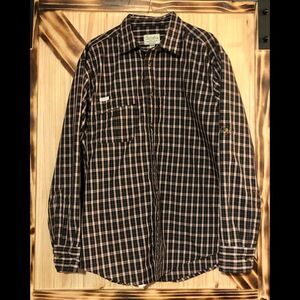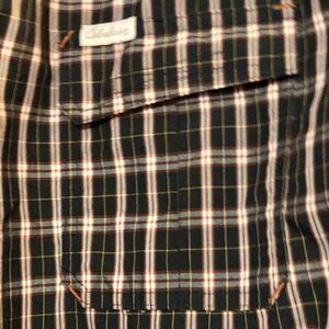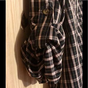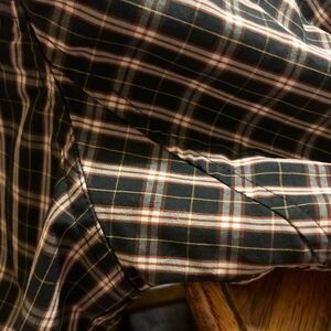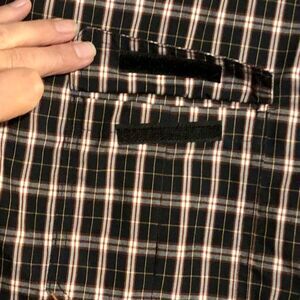 Beautiful black plaid tech style shirt has button tab sleeves, Velcro flap right breast pocket, hidden zip breast pocket at the left. Shirt tail hem. Easy wash and wear polyester seems wrinkle free. Textured buttons for better grip, extras underneath. Gussets at the armpits for freedom of movement. Colors are black white red and gold. Really a quality shirt.