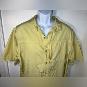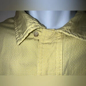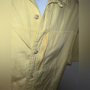 Cabela’s,M, yellow mico check print, button front, wick advance, short sleeve, collar button down shirt with hem slits vertical zip pocket