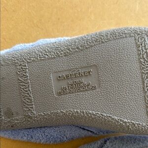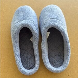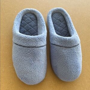 Soft and comfortable blue fleece slippers. Perfect for lounging.