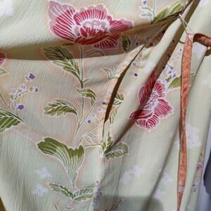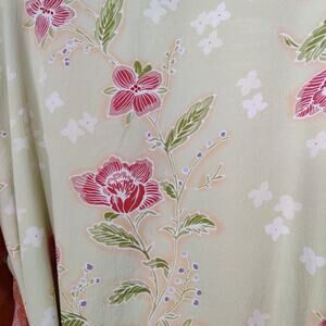 Cabernet Woman beautiful green and orange kimono or robe. Green floral print with orange butterfly flare sleeves and trim. Inside tie, pockets and belt.