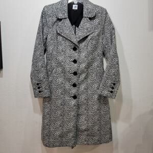 Cabi 007 Trench coat, size Medium. Black & white zebra print trench coat. This coat is belted. Measures 22" across pit to pit and 40" from top of shoulder to hem.