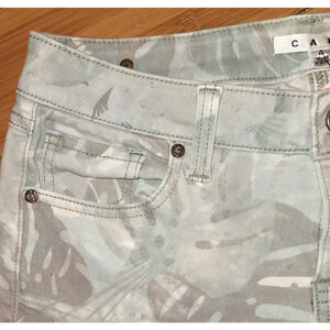 CAbi Paradise Crop Super Skinny green palm leaf jeans. Front button closure, zipper fly, belt loops.