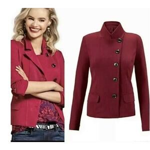 Cabi #3175 Rhubarb Red "Outing Blazer" Button Down Jacket. Can be worn open or buttoned. Subtle shoulder pads. Faux pockets in the front. Buttons along the front and on the backs of each sleeve. Closet staple. Dress up or down. Red is the color of the season.