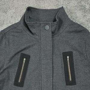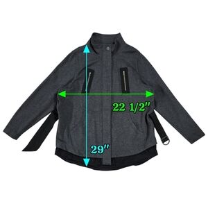 Good used condition, with no stains or tears. A dark grey ponte knit jacket, with black trim. Has a full zip closure, stand collar, attached tie belt, and functional lower pockets. Lined.