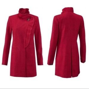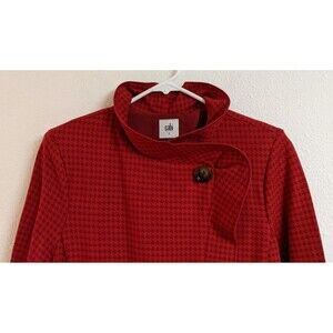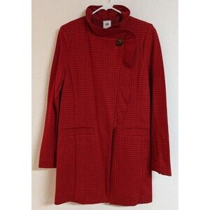 Add a touch of classic elegance to your wardrobe with this beautiful red houndstooth celebration coat from Cabi. This mid-length jacket features a single button closure, long sleeves, and a collared neckline. The jacket is made from a rayon blend knit fabric that is both breathable and stretchy, making it suitable for all seasons.
