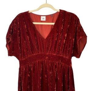 Cabi style #3696 jewel toned terracotta red rust crushed velvet velour Empire Grace Tribute hi-low dress with v-neck and cap sleeve. Empire waist. Size S