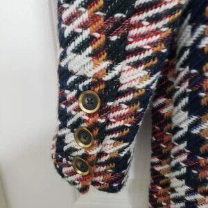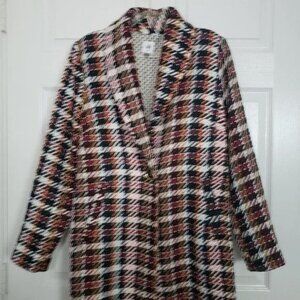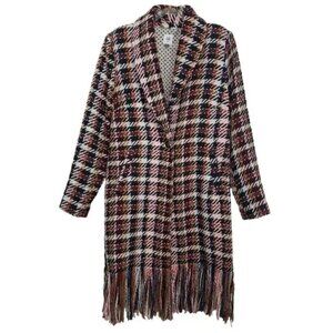 CAbi Regency Coat, Medium, Fall 2020, Item 3901. Noble Plaid. Tailored, long coat. Skims the body. Shawl collar. Long fringe hem. Soft and substantial woven with no stretch. Polka dot partial lining.