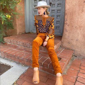 Fall 2020 flower riot print, peasant-style easy-fitting blouse, banded neckline with V-front and self-tie, piping at the shoulder, ruffle down sleeves, elastic cuffs, hits at the mid hip, poly chiffon. Excellent preowned condition, worn once. Approx. Flat Measurements: Bust: 22" Length: 27"