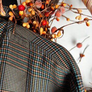 The Reversible poncho features a colorful glen plaid print on one side, and a micro-houndstooth print on the other.