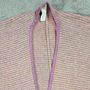 Good used condition, with no stains or tears. A cozy pink and tan stripe sweater cape. Has an open front and no armholes. Has some weird lighting at the bottom of photo 1.
