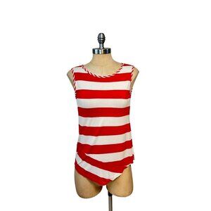 Versatile tank top with an asymmetrical hemline. Red and white stripes for a bold statement.