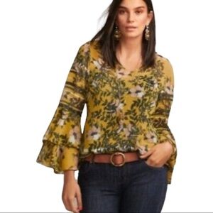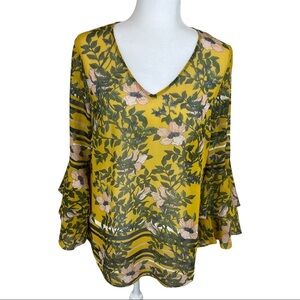 Cabi #5518 Spring Scene Blouse. Beautiful yellow floral chiffon ruffle sleeve blouse with v neckline. Excellent condition. No flaws noted.