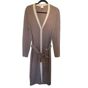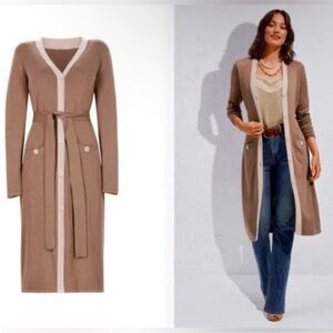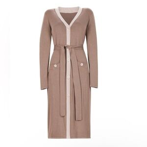 The Genteel Cardigan is an earthy- toned duster with a button-front closure. This understated yet elegant cardigan has a contrasting placket with a tie belt at the waist for added definition. Show off your refined taste in this stunning number.