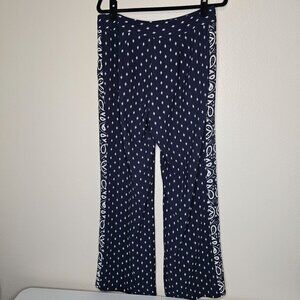 Navy blue printed pants with paisley detail down the sides. Zips up on the side. Pockets. Wide leg.