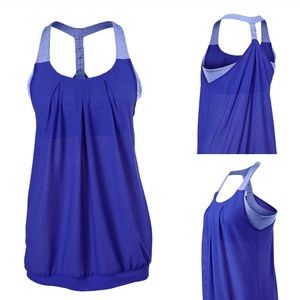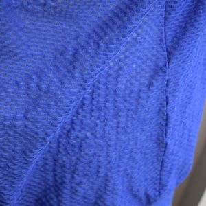 I have been worn and loved on! I have pilling. T-back tank in sporty cobalt mesh does double style duty with its shelf bra for workout support and its blouson-banded waist for style. Mesh overlay is sheer and you can see built-in shelf bra underneath. Self: 95% polyester, 5% spandex. Contrast 44% cylon, 44% polyester, 12% spandex, exclusive of trim. Machine wash with like colors and cold water on delicate cycle. Only non-chlorine bleach if needed. Lay flat to dry, warm iron if needed.