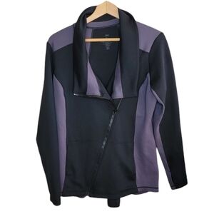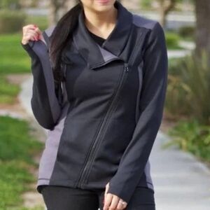 Black and gray colorblock asymmetrical zip front jacket in a soft, buttery fabric.