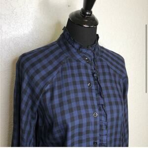 Cabi Aberdeen blue black plaid ruffle trim button down top.