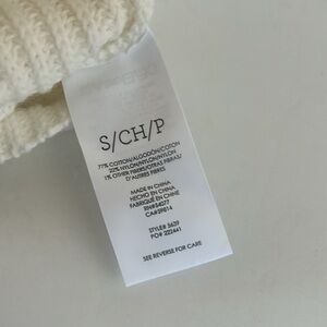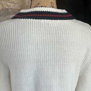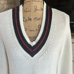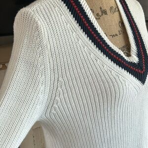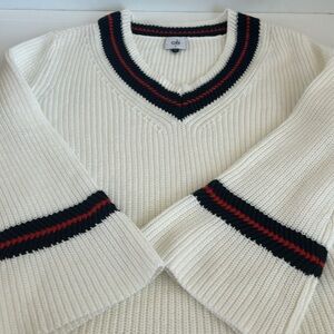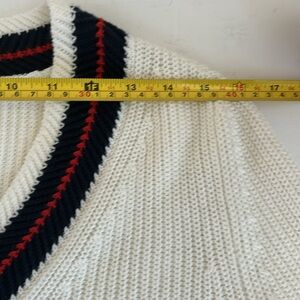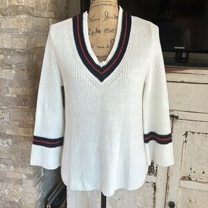 Cabi Ace pullover cream knit vneck sweater bell sleeve red blue stripe side slit