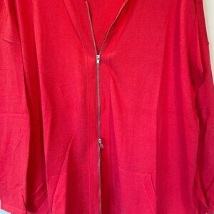 Soft & lightweight Cabi "beachcomber hoodie" sweater. Soft & cozy yet lightweight & flowy for spring or summer. Color is a bright watermelon pinkish-red. Silver-tone zipper in front with lightweight hoodie in back. Zipper is bi-directional for style changes.