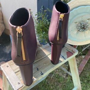 Like New (Sample Shoe) with box. Bisset Bootie in wine and black pattern. Higher round heel with zipper back opening. Smoke free home.