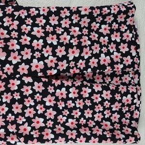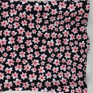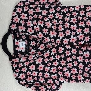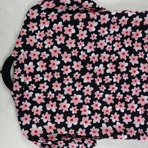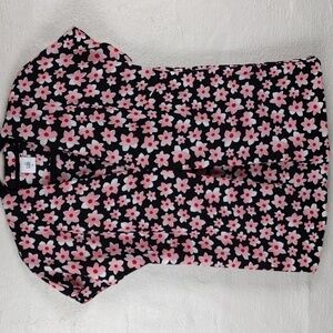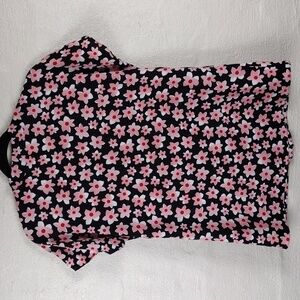 Cabi Black Pink Floral V-Neck Pleated Front Short Cap Sleeve Pullover Tunic Top