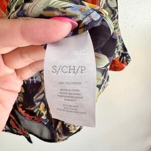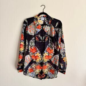 Cabi Black + Red Semi Sheer Amour Printed Long Sleeve Collared Blouse Small