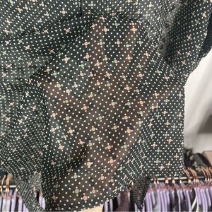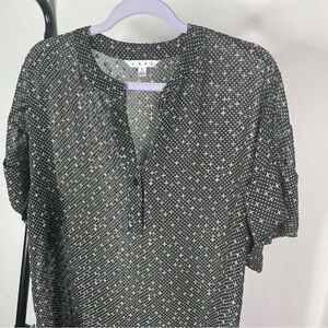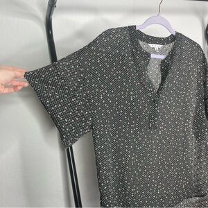 Size small. High low hem with slits on the sides and a rounded hem in front. Cuffed wide sleeves. One button enclosure at the neck. Very unique pattern- black w white, salmon pink, & sage green polka dots. Black textured polka dots on top.