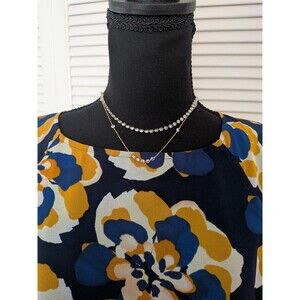 The Cabi Blouse Womens M Blue Yellow Floral Chiffon Lydia Top is a versatile and stylish addition to any wardrobe. With a beautiful floral pattern in shades of blue and mustard yellow, this blouse features long dolman sleeves, a round neckline, and a pullover closure for easy wear. Made from chiffon material and polyester fabric, it is machine washable for convenience. Perfect for various occasions including travel, casual outings, or even business settings, this blouse combines a touch of cottagecore charm with a classic and colorful design that is suitable for all seasons.