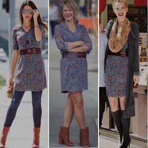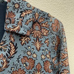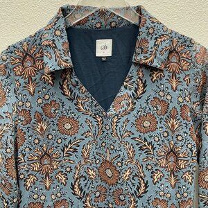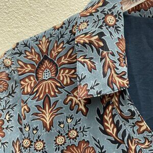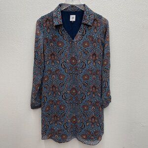 Cabi Blue Floral Provincial Dress. Size XS. 100% polyester floral print fabric in blue, black, tan and brown. Collared with v-neckline. Sheer cuffed sleeves with body of dress lined. Excellent Preowned Condition. (Cabi #3295)