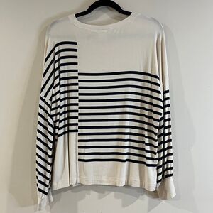 Cabi brand Box Stripe Tee in Sapphire Stripe. Features a crew neckline, bell sleeves with cuffs and is crafted in delectably soft baby rib knit for all-day comfort. Oversized fit, seams in front and back, bell sleeves to cuffs, hits at the high hip. Tag size Small. Underarm to underarm measurement is 27 inches. Total length from shoulder to hem is 24 inches. Excellent preowned condition!