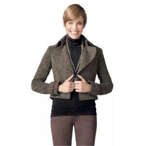 This brown tweed blazer features a tailored fit and a notched lapel collar, offering a classic and versatile style. Its earthy tone and textured fabric make it a perfect choice for both casual and formal occasions. The blazer's short length adds a modern touch to its timeless design.