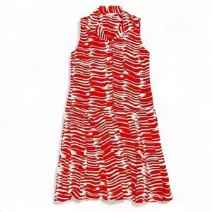 Cabi Brushstroke Drop Waist Pleated Sleeveless Shift Dress Red White Medium
