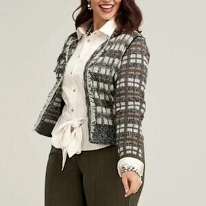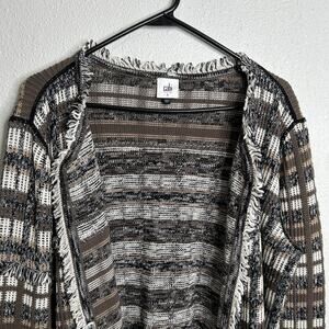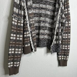 Cabi Cardigan Women Medium Brown White Plaid Fringe Open Front Knit Sweater