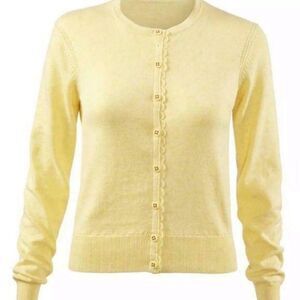 Cabi Size Medium Yellow Cardigan Sweater Lace Confetti Sunny Sunshine Academia Measurements in photos. Very good pre-owned condition. No rips, holes, or stains. Comes from smoke free environment.