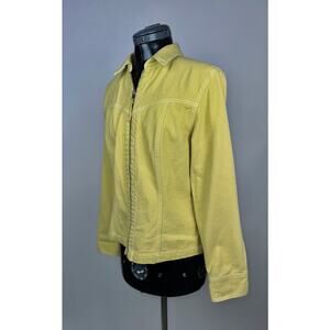 Denim jacket in trending chartreuse color. Unique color but easy to wear — simple, tailored fit that’s naturally flattering.