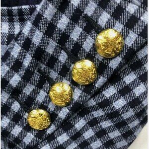 The Checkup Blazer jacket. Periwinkle and navy blue check plaid print on a comfy stretchy fabric. Accented with panels of blue ribbed knit. Collared. Single button closure. Four button cuffs. Gold metal emblem crest buttons.