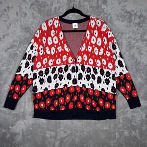 Bold and eye-catching, this Cabi cardigan features a vibrant red, white, and navy leopard print pattern that adds instant style to any outfit. Details: • Brand: Cabi • Style: Button-front cardigan sweater • Color: Red, white, and black multicolor • Pattern: Colorblock leopard print • Material: 100% cotton • Size: Small • Made in China • Style #6163 | RN# 58717 | CA# 59874 • Fit: Relaxed / loose fit Approximate Measurements: • Pit to pit: 21.5” • Length: 24” • Sleeve length: 18” Condition: Preowned. Please review all images for a complete view of the item’s condition before purchasing.