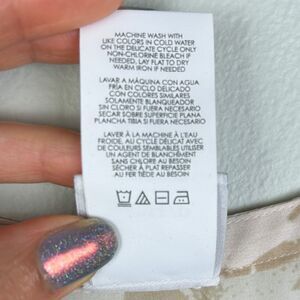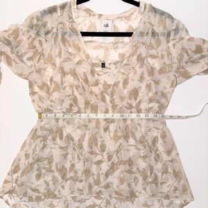 Cabi Couplet Blouse in a beige and cream abstract botanical leaf print. This beautiful, flowy boho top features a sheer chiffon long sleeve v neck top layer and an added matching cami for coverage. Long, billowy balloon sleeves with bottom cuffs for a soft romantic feel with stunning seam detail at shoulders. Excellent used condition. Women's size S small, measurements pictured.