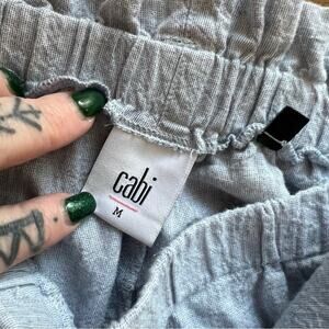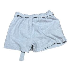 Cabi Court Skort In Denim Chambray in a size medium. Has two front pockets and a tie waist removable belt. Paper bag elastic fit waist, with hidden button fly. High rise. 99% cotton, 1% spandex. Measures approximately 15 1/2” flat lay waist, 11” rise, 4” inseam. In great condition.