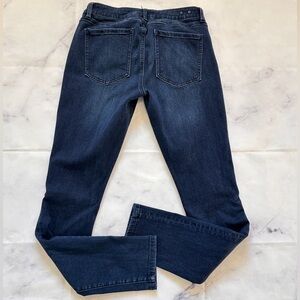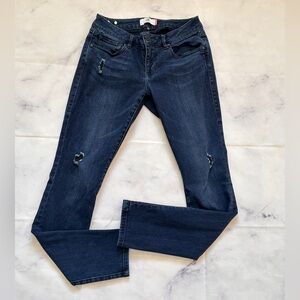 Distressed front, Whiskering, Button and zip front, Pockets, Skinny