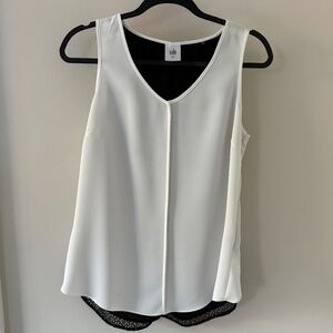 Cabi Women's Domino Mesh Layered Sleeveless Blouse White Black. Size Small. Preowned. In excellent condition FEATURES: • Layered • V-Neck • Center French seam • Criss-cross split layered open fabric over sheer black fabric & black mesh fabric • Slight hi-lo hemline • Polyester • Machine Washable