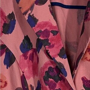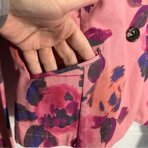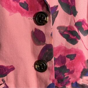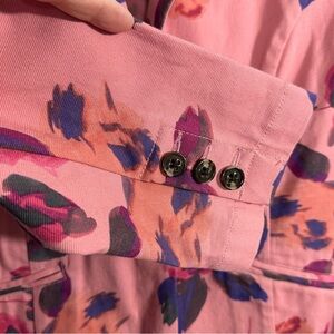 Cabi "Dream Day" jacket in size 10. Gorgeous pink florals, 98% cotton/2% spandex. Lightweight denim, unlined, long sleeve. Two front buttons, two front pockets.