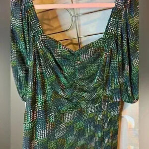 NWT Cabi Elaine Dress. Multi-color. Stretchy double mesh fabric won’t wrinkle. Elastic puff sleeves. Ruching at the breast. Smocking at the back. Size M. P2P 19”. Snap closure to hold your bra in place.