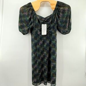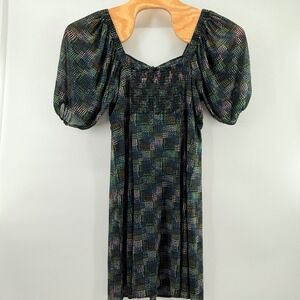 Cabi Elaine Dress Medium Open Road Artsy 3D Print Smock Boho Sheer Puff Sleeve