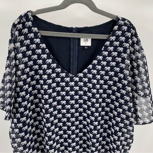 Cabi Elephant Parade Navy White Chiffon Overlay Banded Knit Body/Bottom Zip Top